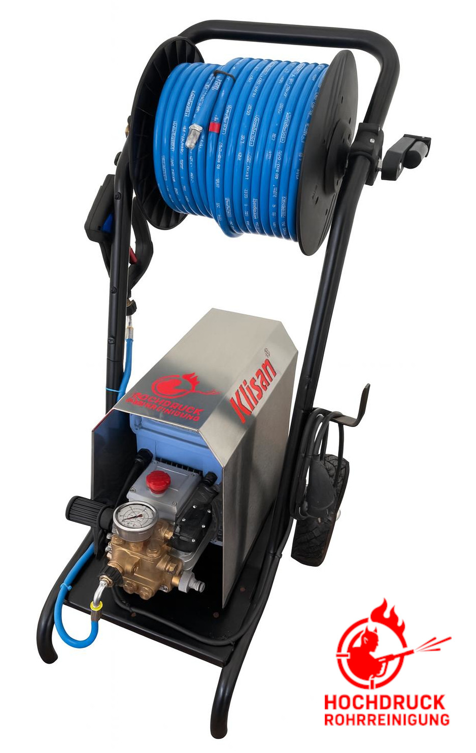 Der Klisan® Pipe Devil ist mit einem leistungsstarken Kränzle Aggregat ausgestattet. Auf dem praktischen Fahrwagen befindet sich eine Schlauchtrommel mit 30 m Rohrreinigungsschlauch.